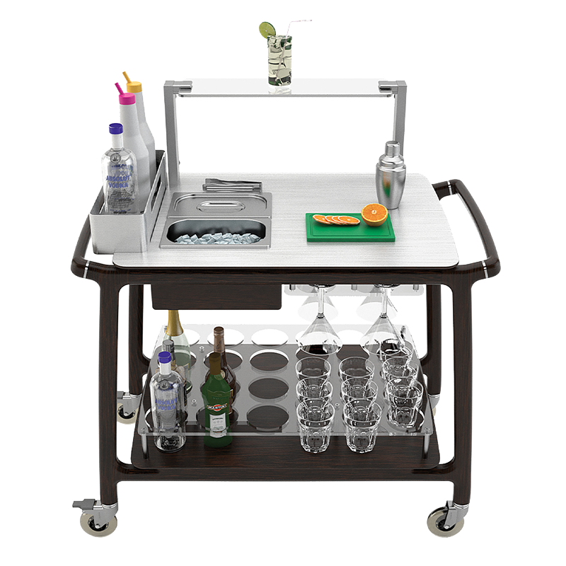 Carro de cocktails Alto Mixology – em madeira maciça e com tampo superior em aço inox, duas cubas embutidas, caixa metálica lateral integrada e painel frontal em acrílico.