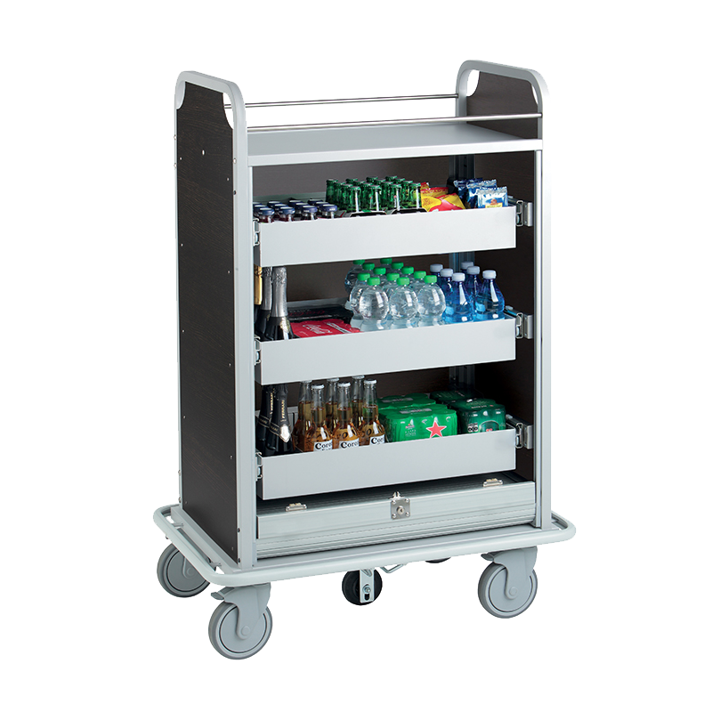 Carro de reposição de minibares BORA BORA M – com estrutura tubular em aço e painéis laterais e traseiro em HPL com 4 acabamentos à escolha. Para-choques perimetral na base.