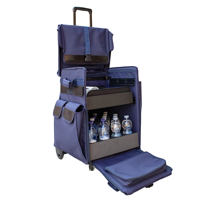 Carro de reposição de minibares BUDDIE BAR KIT – em PVC hidro-repelente e polyester, na cor azul. Tampa rígida, e fecho com cinta. Bolsa compacta e ergonómica adequada para o serviço de turn-down, com quatro divisórias interiores ajustáveis, com velcro. Acoplado com fita elástica traseira.