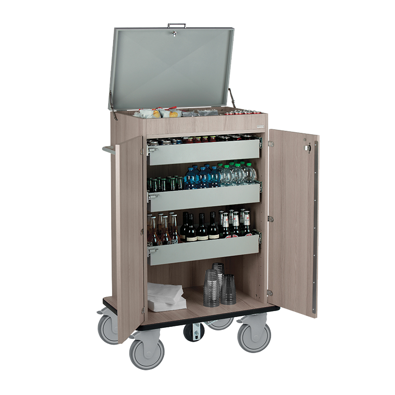 Carro de reposição de minibares CHARLOTTE M – com estrutura em laminado de madeira, com vários acabamentos à escolha, pega na lateral e para-choques perimetral, fino, na base.