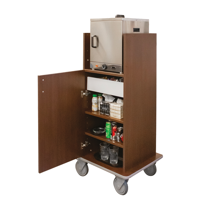 Carro de Room Service THELIVERIE – com estrutura em laminado de madeira, com vários acabamentos à escolha, pega na lateral e porta frontal.