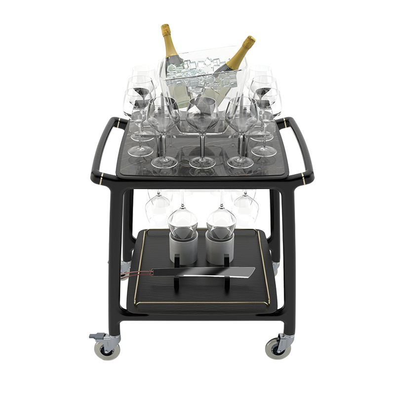 Carro de serviço de champanhe Alto Bolla – em madeira maciça e prateleira superior revestida a HPL com efeito mármore.
