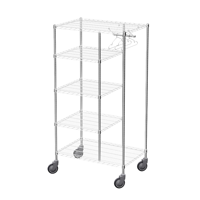 Carro multifunções VERSO EASY R – em aço cromado, com quatro prumos verticais, nos cantos, e dois prumos centrais para separação em duas áreas, uma para pendurados, com varão extensível até 500 mm, e outra com três prateleiras ajustáveis. Prateleira superior e inferior a toda a largura.