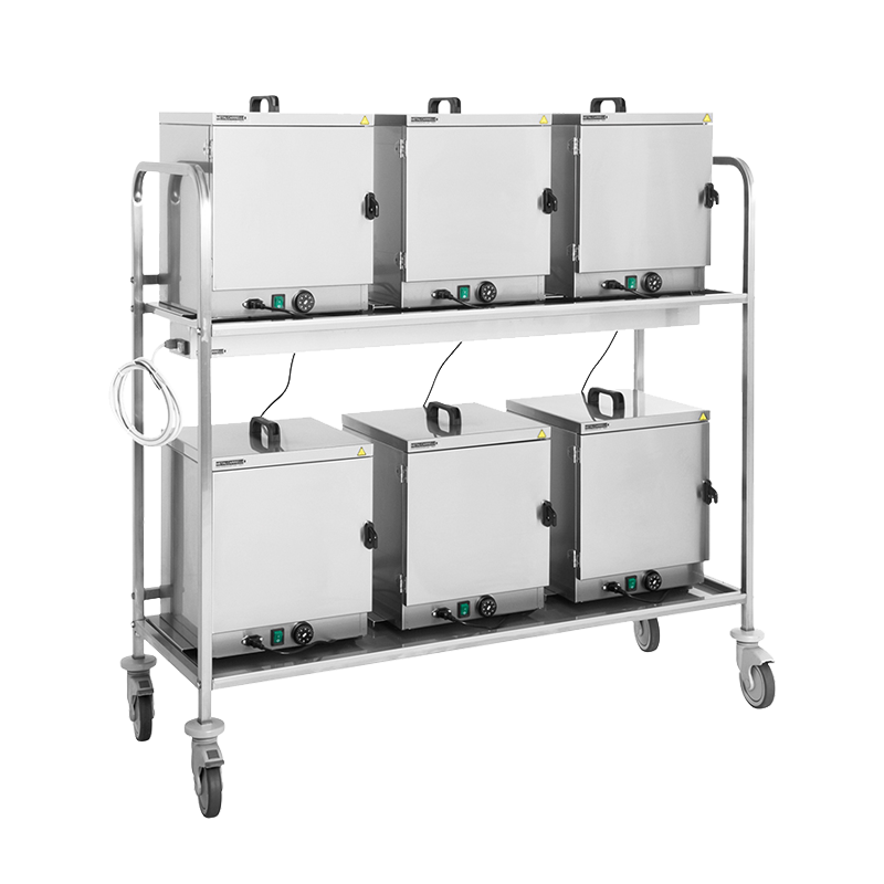 Carro para arrumação BOX TAXI ECO – em aço inox e pré-aquecimento de até seis hot box easy, em dois níveis.