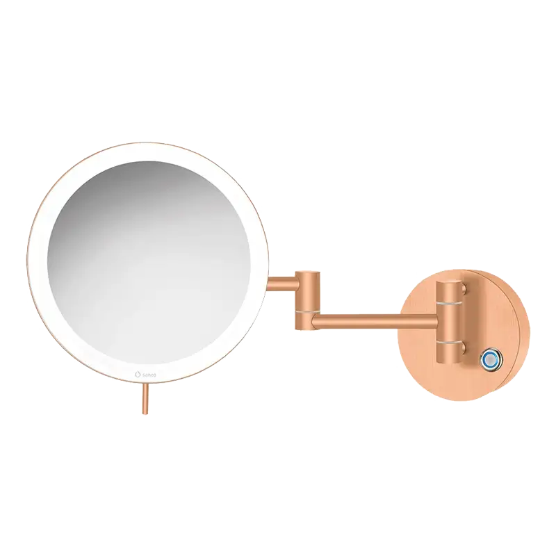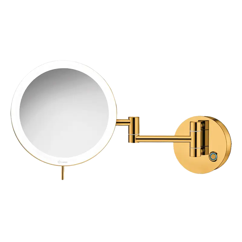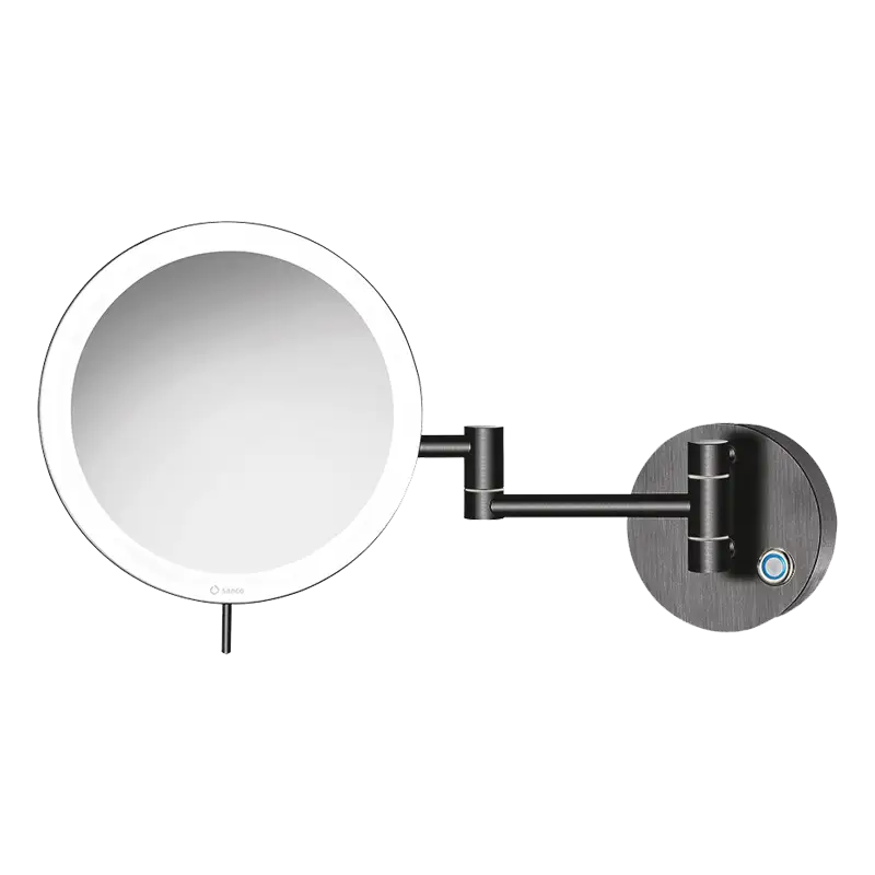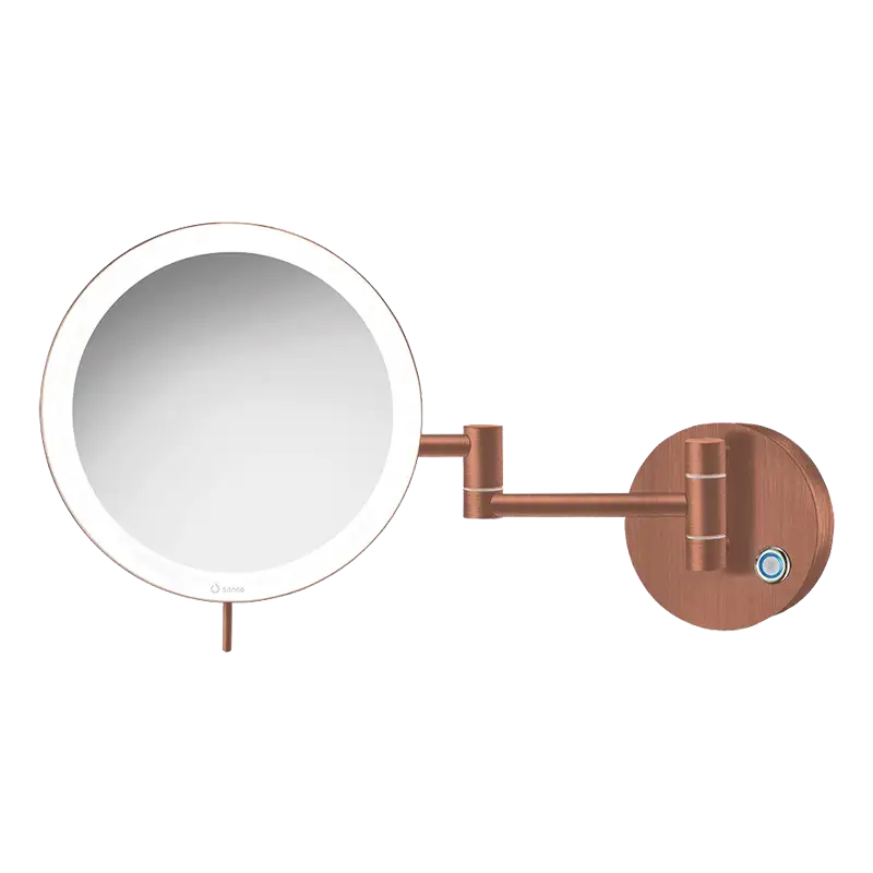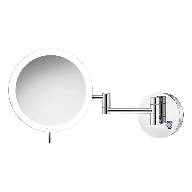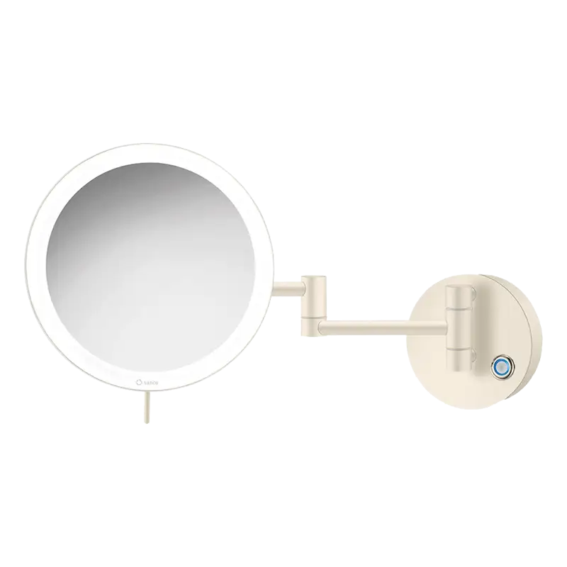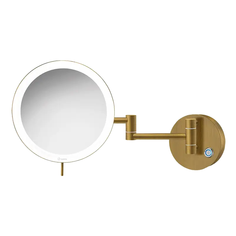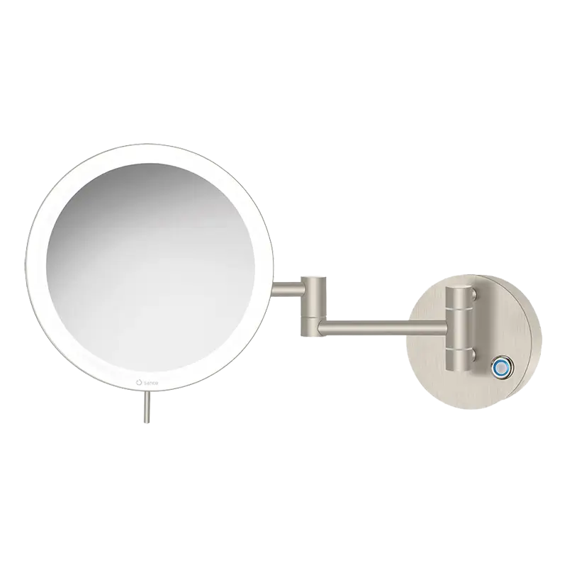 Espelho cosmético redondo, de parede, com 2 braços – aumento 3X, luz LED de 590 lumen regulável (Luz fria 6.000 K / Luz ambiente 2.700 K) e botão touch.