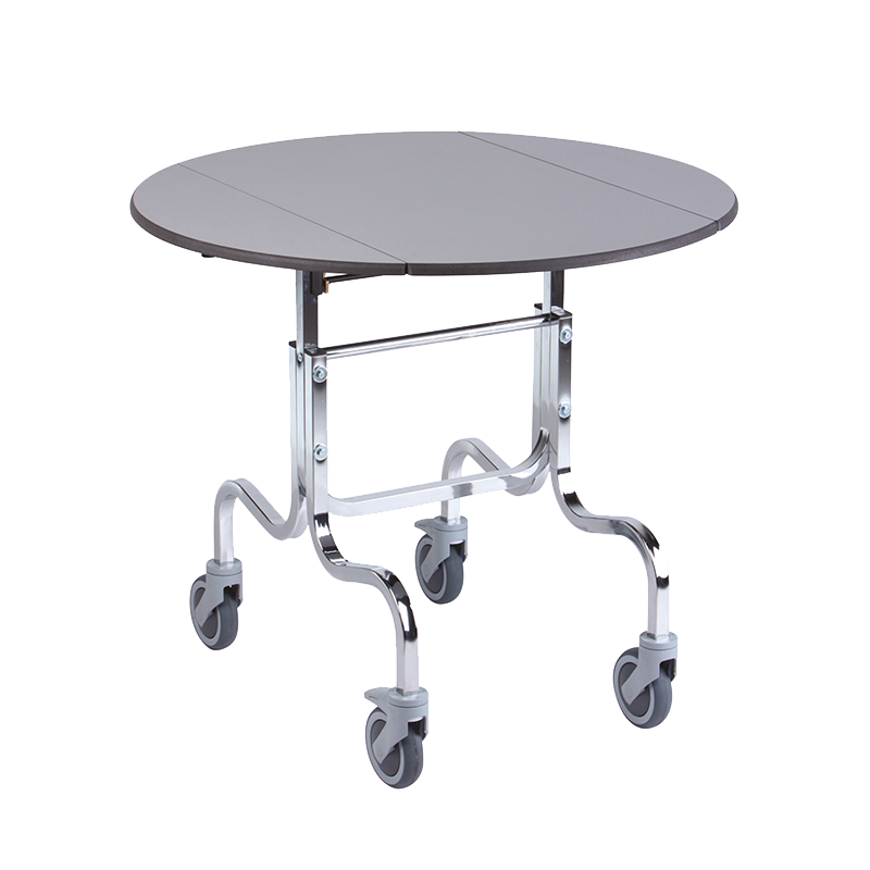 Mesa de room service TABLE FLIP TOP – com tampo redondo em madeira maciça CDF na cor grafite e estrutura da base em aço cromado.