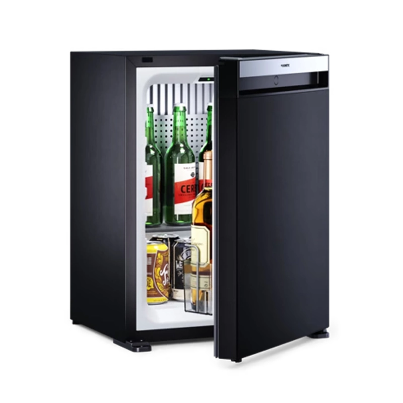 Mini-bar Dometic HiPro Evolution A30S2 da classe de 30 lt (capacidade útil interior – 26 lt) em preto, porta em aço inox, de abertura para a direita (com sistema Quick-fix para encastrar) e pega em alumínio integrada.
