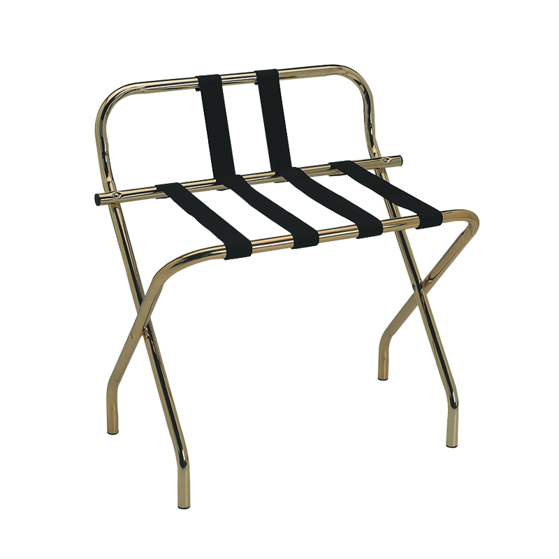 Porta malas LUGGAGE RACK BR S – articulado com estrutura tubular em aço com acabamento de efeito latão, com Ø 25 mm, e quatro tiras em PVC preto.
