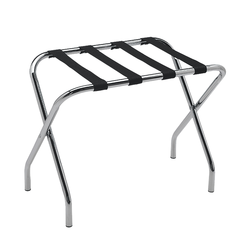 Porta malas LUGGAGE RACK CR – articulado com estrutura tubular em aço cromado escovado, c/ Ø 25 mm, e quatro tiras em PVC preto.