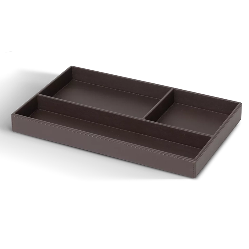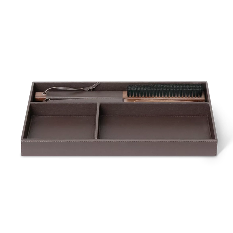 Tabuleiro de roupeiro – Cebu Classic – com 3 divisões interiores, uma delas para os modelos Comino e Flaster. Estrutura em madeira revestida a eco-pele castanha escura com costuras à vista.
