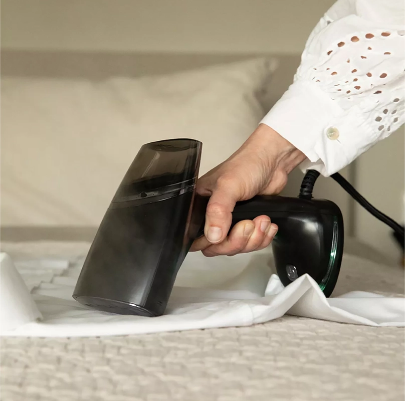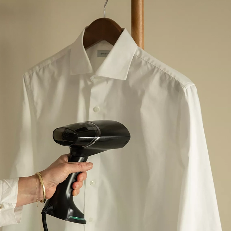 Vaporizador de roupa portátil Brise 3412, da marca Bentley Europe, com base em aço inox e carcaça em plástico preto.